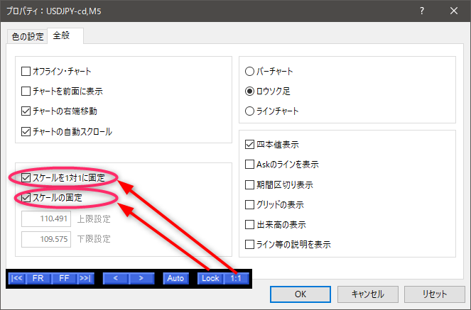 プロパティのウインドを開かなければ操作できない「スケールの固定」「スケールを1対1に固定」をボタン化したため「M1」「M5」等の短期足の正確な検証が効率的にできます。
