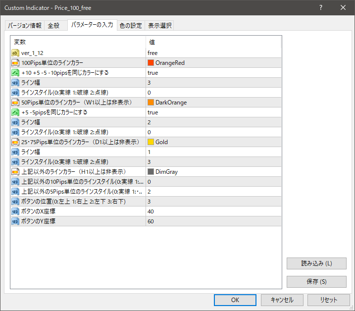 100pips・50pipsの単位毎に線の種類や太さ、色などを指定することができます。