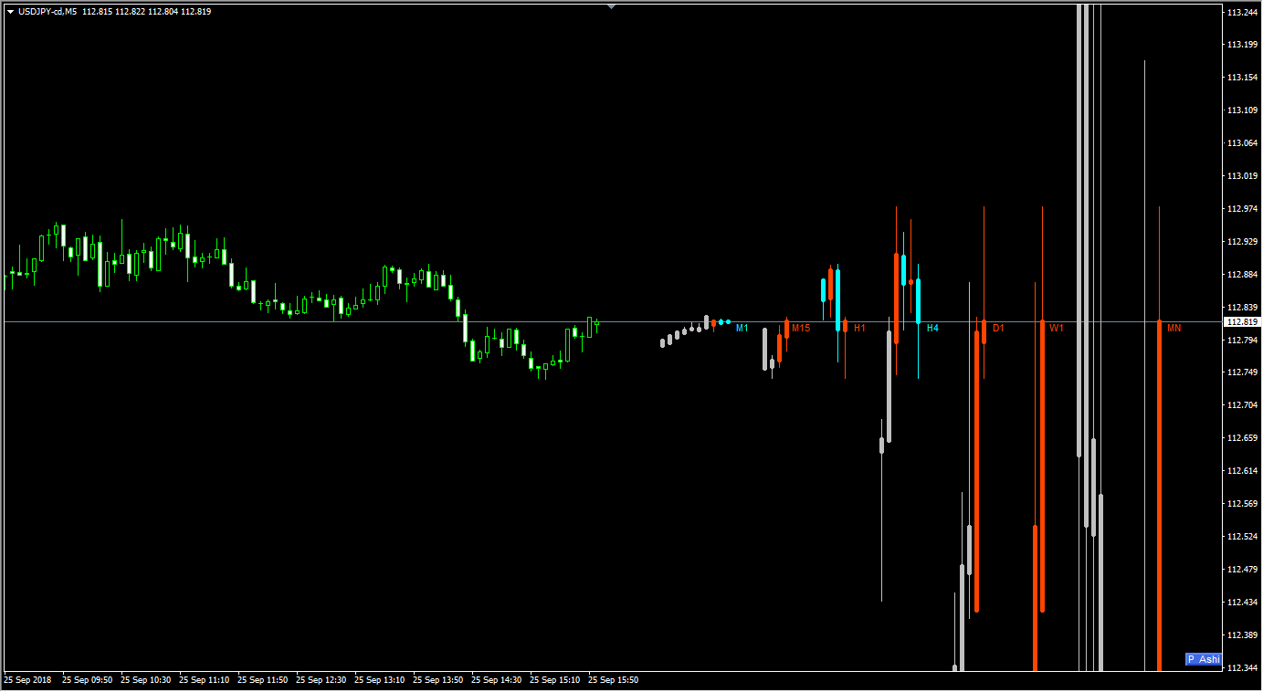 複数の時間足をチャートの右側へ表示するインジケータ。同一スケールで並べて表示するため微妙な足の節目(レジサポ)のあぶり出しに役立ちます。