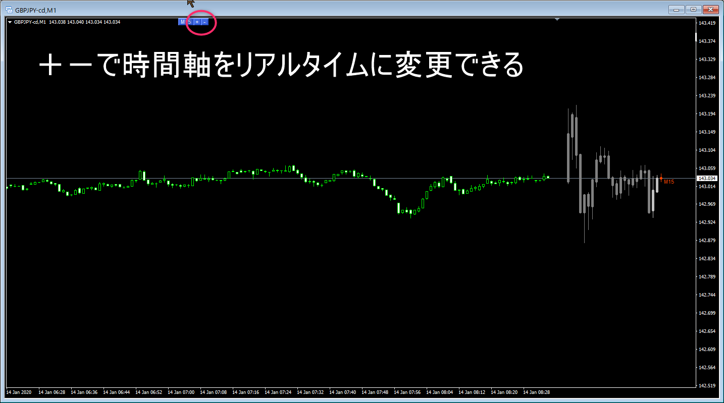 特徴2:「-」ボタンで下位足に、「+」ボタンで上位足に表示をリアルタイムに変更することができます。↓