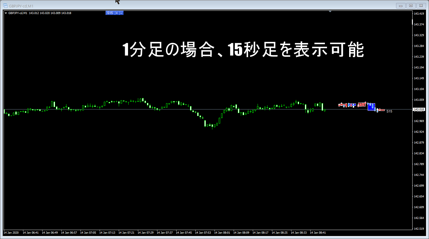 特に1分足使用時に限り「15秒足」を表示することができますのでスキャルピングの手助けになるのではないかと思います。(ただし、時間足を切り替えるとデータ蓄積に1分間必要です)
