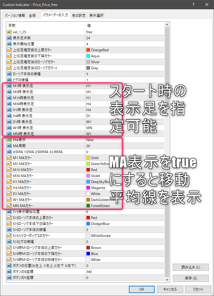 ※1「選択時間のMAを使用」はインジケーターを複数使用している場合、MAが重複するなどして迷惑な時は「false」に変更すれば表示時間のMAのみを非表示にできます。